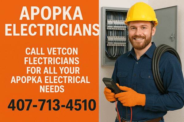 Electricians in Apopka FL work hard to satisfy every customer we meet. Whether you have a flickering light or need a top to bottom electrical upgrade our Electricians in Apopka FL can do it all! We always deliver a quality solution. Vetcon Electricians of Orlando offer no-hassle pricing, fast service, and a workmanship guarantee you can always count on. We have years of hands-on electrical experience and training on the books to ensure your electric service is safe, modern and ready for tomorrow!
